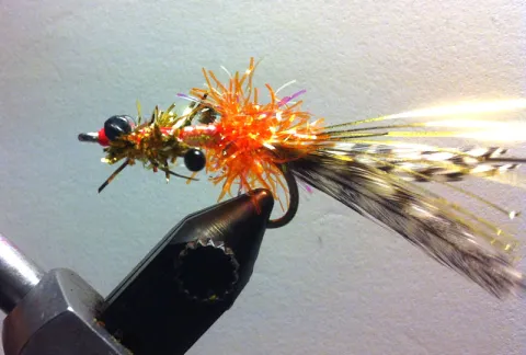 6. Tie in midway between the chenille and the hook eye, pointing towards the rear of the fly