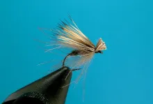7. Hang the hackle pliers in front of the wing post on the near side of the hook, pull back the post and legs, tie in the ribbon and remove the waste.