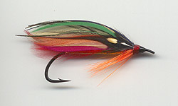 From bottom to top - pink swan, orange swan, four strands of peacock herl, green swan, hyacinth macaq, on each side a red cock hackle