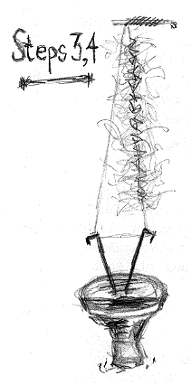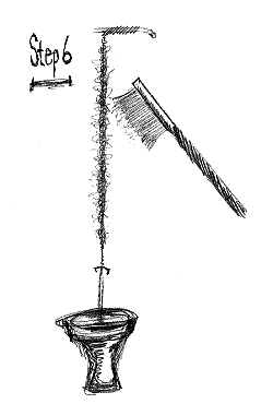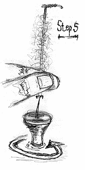 Step 5. Hold the loop near the bottom with your forefinger and thumb of one hand, then spin the dubbing spinner gently, letting it slow down and stop on its' own accord. Grasp the dubbing spinner to prevent it from unwinding and release your thumb and forefinger just above it while applying tension downward on the loop. The thread twists will work their way up the loop thusly trapping and spinning the dubbing hank within. Be careful not to over-twist the loop. You may break the thread under to much tension or create a dubbing rope versus a bushy dubbing loop. However, a dubbing rope is desirable for making segmented bodies on nymphs.